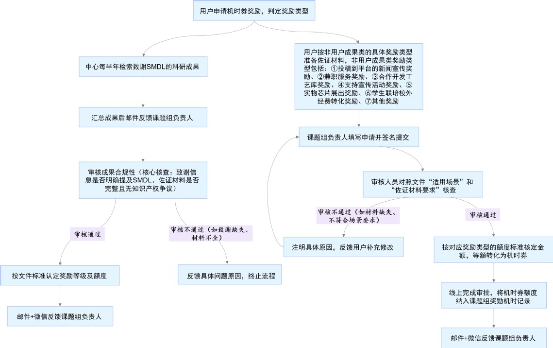 (4)审批发放:审核通过后,中心根据表格“奖励额度”标准确定具体奖励金额(等额转化为机时券),完成线上审批后纳入奖励机时记录中。
