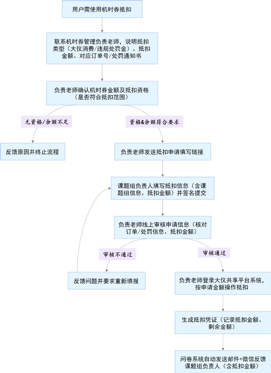 1. 沟通申请:用户需使用机时券抵扣时,联系平台机时券管理负责老师,说明抵扣类型(大仪消费或违规处罚金)、抵扣金额,确认机时券余额及抵扣资格。