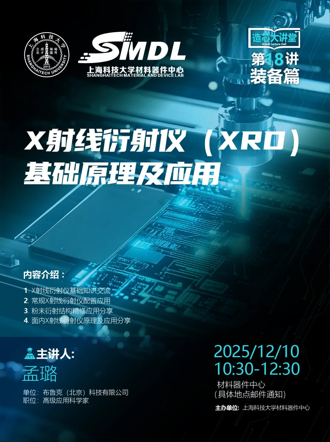 上海科技大学材料器件中心《造芯大讲堂》系列课程2025年第十八讲【装备篇】将于12月10日上午开课,主题为《X射线衍射仪(XRD)基础原理及应用》。诚邀感兴趣的师生和用户参加!