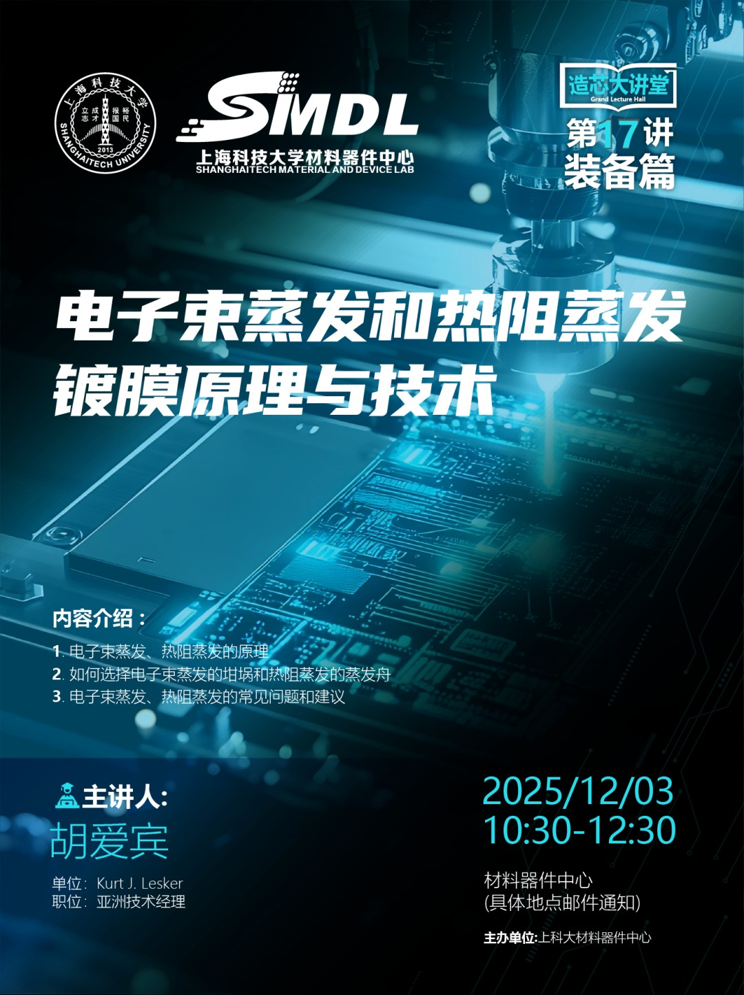 上海科技大学材料器件中心《造芯大讲堂》系列课程2025年第十七讲【装备篇】将于12月3日上午开课,主题为《电子束蒸发和热阻蒸发镀膜原理与技术》。诚邀感兴趣的师生和用户参加!