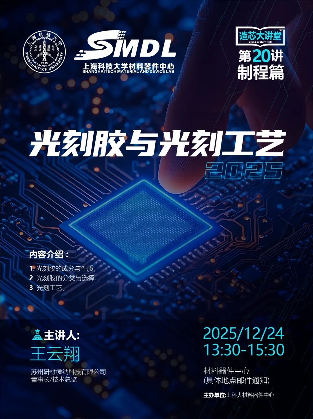 上海科技大学材料器件中心《造芯大讲堂》系列课程2025年第二十讲【制程篇】将于12月24日下午开课,主题为《光刻胶与光刻工艺》。诚邀感兴趣的师生和用户参加!