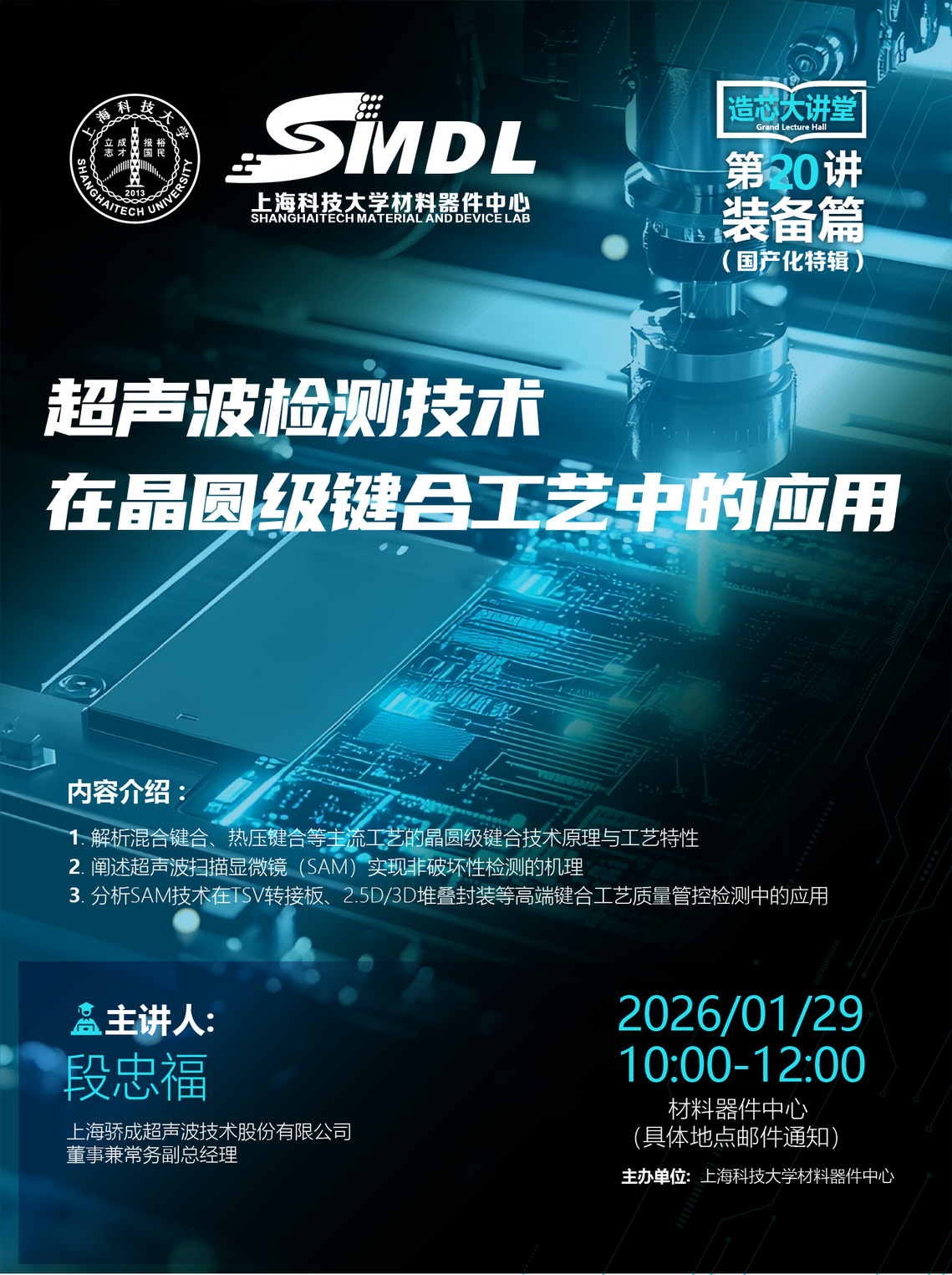 上海科技大学材料器件中心《造芯大讲堂》系列课程第二十讲【装备篇】(国产化特辑)将于1月29日上午开课,主题为《超声波检测技术在晶圆级键合工艺中的应用》。诚邀感兴趣的师生和用户参加!