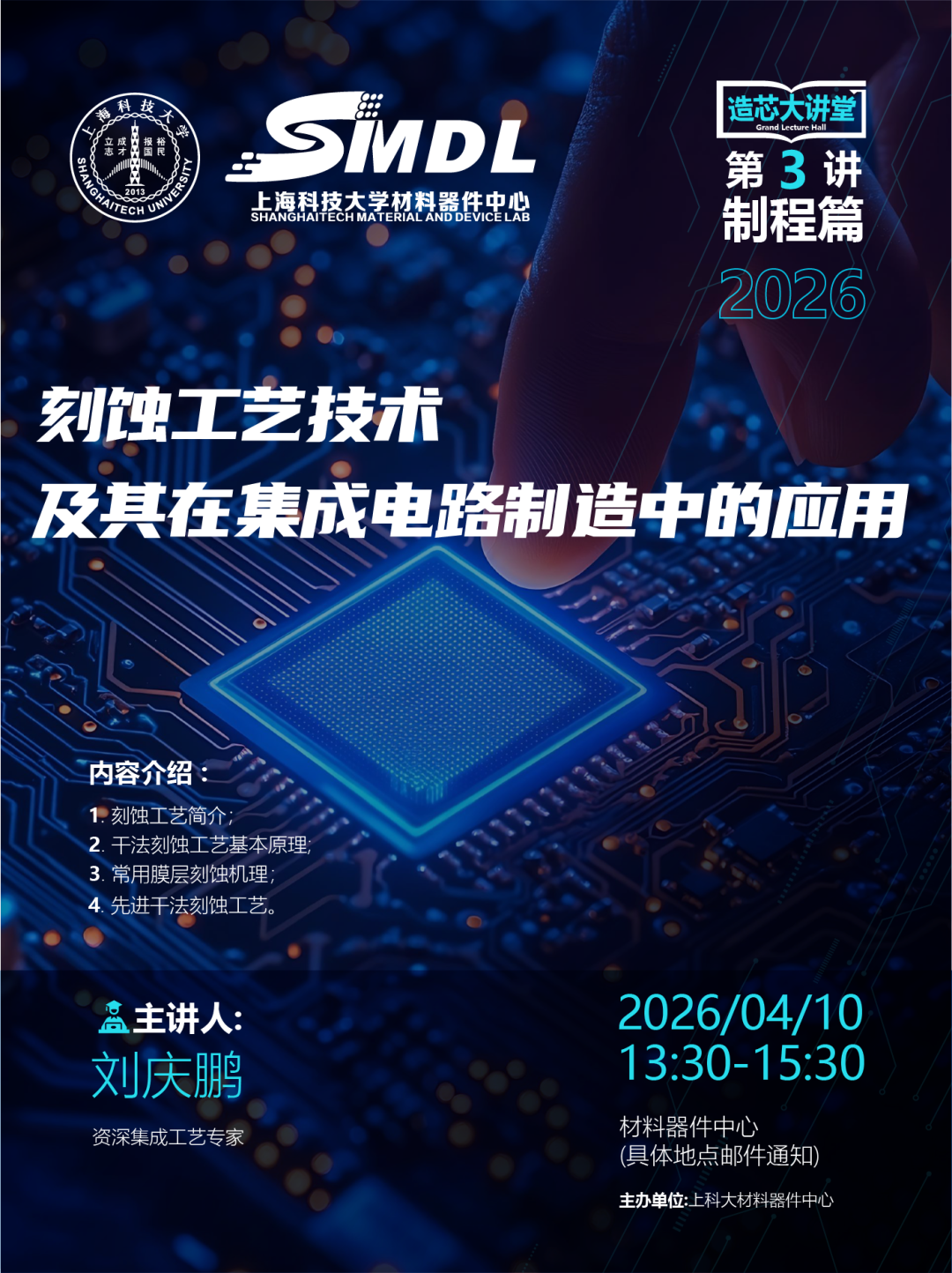 上海科技大学材料器件中心《造芯大讲堂》系列课程2026年第三讲【制程篇】将于4月10日下午开课,主题为《刻蚀工艺技术及其在集成电路制造中的应用》。诚邀感兴趣的师生和用户参加!