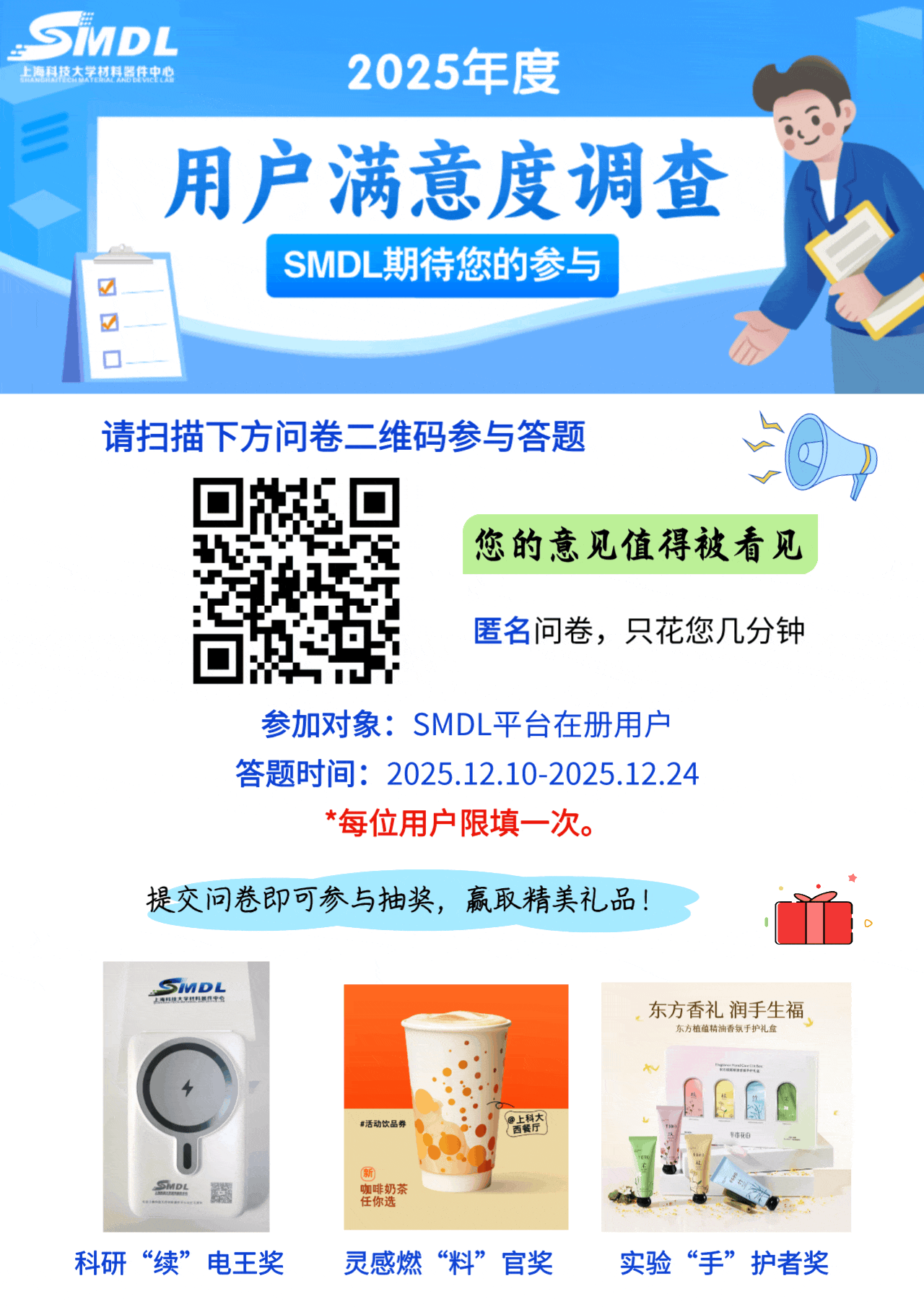 为持续提升本平台的服务质量与运营水平,为您提供更好的科研支撑环境,我们诚挚地邀请您参与上海科技大学材料器件中心(SMDL)2025年用户满意度调查问卷,对SMDL的服务情况、管理与制度等方面作出评价。您的真实、客观评价对我们非常重要。为了感谢您的参与,我们为您准备了丰厚的奖品!