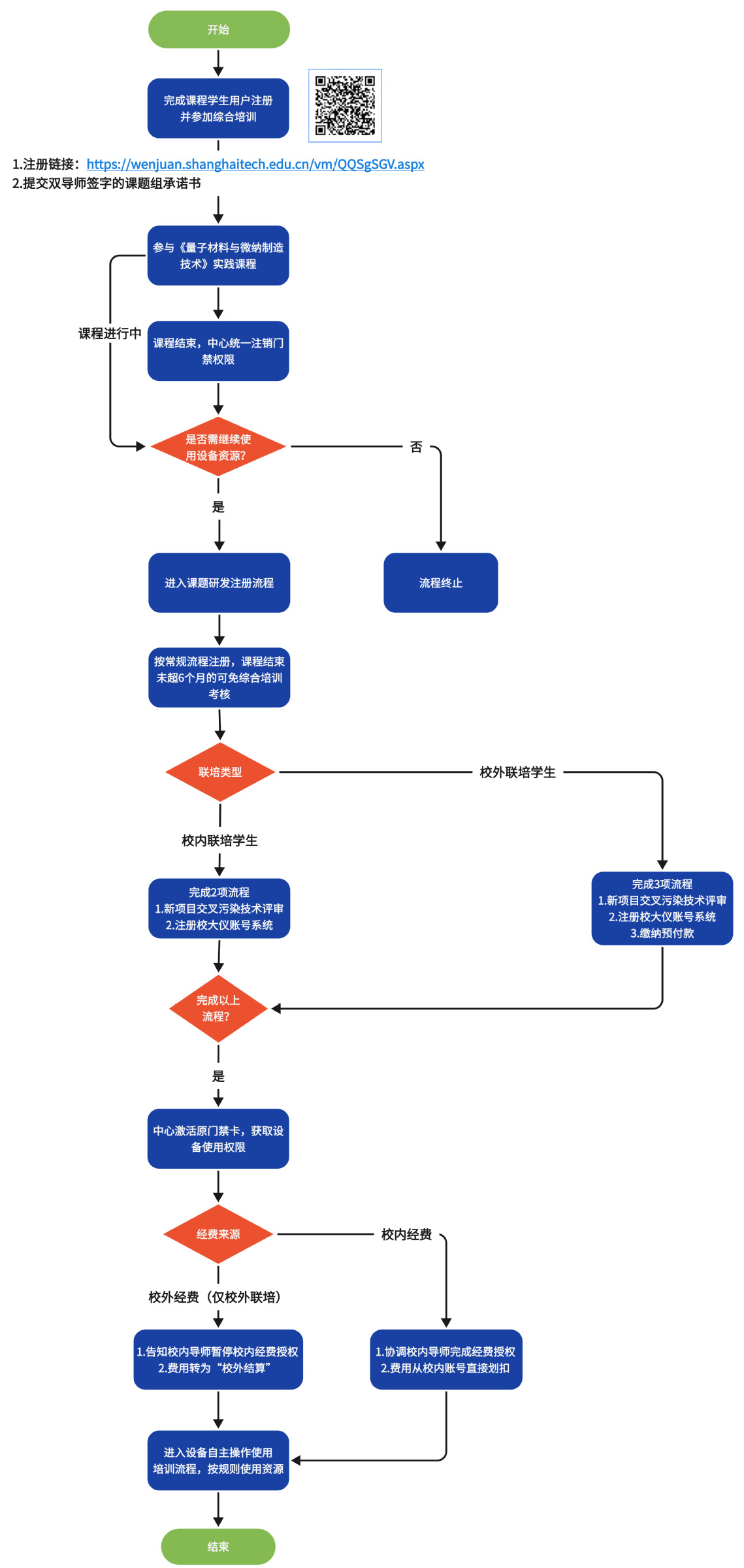 若学生在课程期间或课程结束后需使用中心平台及一楼研发线设备资源,需按以下流程办理注册及经费结算手续: