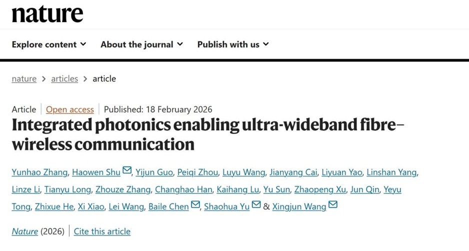 2月19日,国际学术期刊《自然》(Nature)在线发表了题为“Integrated photonics enabling ultra-wideband fibre-wireless communication”(集成光子学助力超宽带光纤-无线通信)的研究论文。该研究由上海科技大学陈佰乐教授团队、北京大学王兴军教授-舒浩文研究员团队、鹏城实验室余少华院士团队及多家科研机构联合攻关,通过开发超高带宽的集成光子器件,成功打通了光纤通信与无线通信之间的“带宽鸿沟”,实现了单路超500 Gbps的光纤传输和400 Gbps的无线传输。