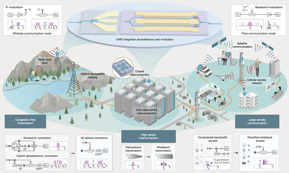 图 2:该图展示了由集成光子系统支撑的全光超宽带通信连接的概念示意,包括光纤—无线无拥塞传输、高速光纤互连以及高密度光纤—无线接入等应用场景。