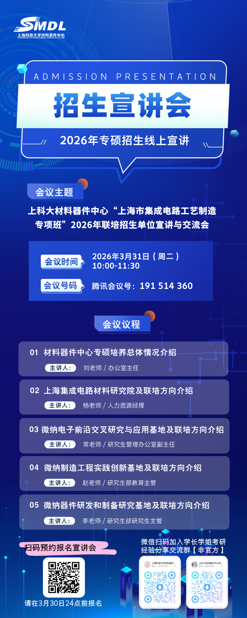 上海科技大学材料器件中心2026年联培调剂招生线上宣讲交流会将在3月31日(周二)上午10点启动,详情见下方海报。